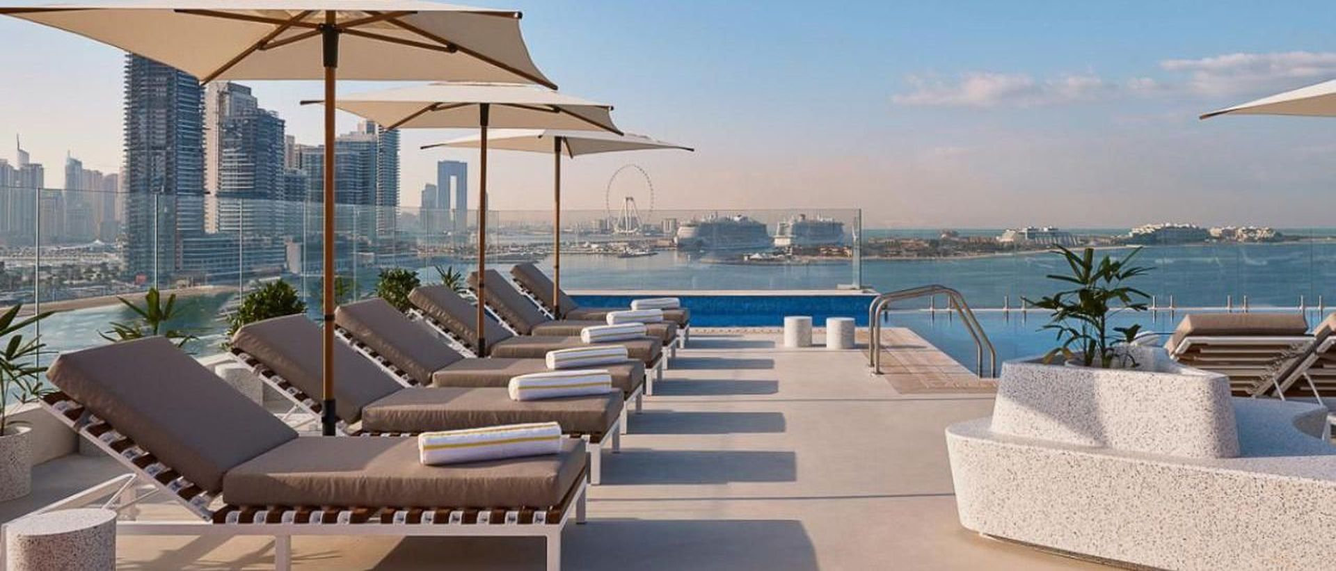 На крыше работает открытый инфинити-бассейн с баром — идеальное место для встречи заката с видом на Персидский залив.